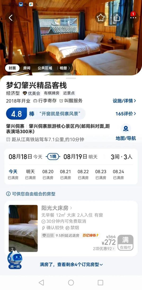 酒店預(yù)訂平臺(tái)顯示,“夢(mèng)幻肇興”客棧價(jià)格在272-403元之間,2018年開(kāi)業(yè),平臺(tái)顯示所有日期的房源全部“已滿房”。