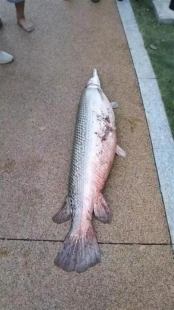 8月13日上午9時許,有網友發視頻稱,廣州白云湖公園又一次發現一條鱷雀鱔,非常腥臭。視頻中,有人抓著一條體長超過1米的大魚的嘴,將它從岸邊拖到道路上,路邊停放著一輛標注“治安巡邏”的電動車。