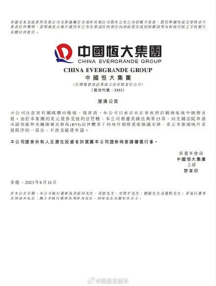 近日網上出現恒大在美國提出破產保護的報道。8月18日,中國恒大發布澄清公告稱:“本公司目前正在正常按照計劃推進境外債務重組。由于本集團的美元債券受紐約法管轄,本公司根據美國法典第11篇第15章,向美國法院申請承認香港和英屬維爾京群島(BVI)法律體系下的境外債務重組協議安排,系正常推進境外重組程序的一部分,不涉及破產申請?!?/p>
