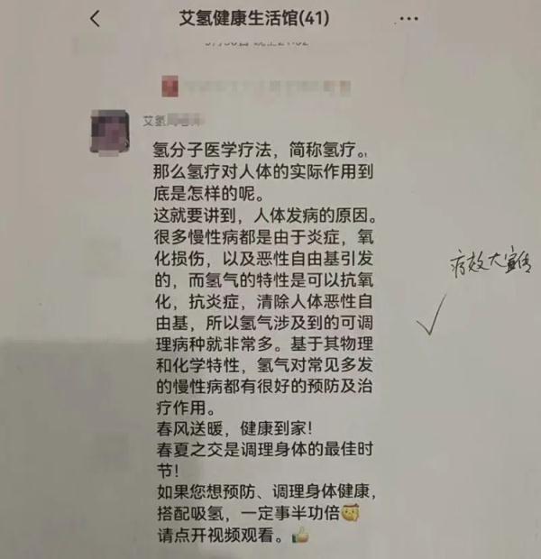 該門店組建了一個(gè)數(shù)十人的微信群聊,群內(nèi)成員多是些老人。該門店人員經(jīng)常在群內(nèi)發(fā)送“氫氣、氫水能治療疾病”的相關(guān)鏈接。該門店人員還在群內(nèi)稱:“最近看到不少堅(jiān)持按我要求使用的會員報(bào)來喜訊,說眼睛好多了,降壓藥、降糖藥、胰島素減量了。”“氫氣的特性就是抗氧化、抗炎癥,清除人體惡性自由基,所以氫氣涉及的可調(diào)理病種非常多,氫氣對常見多發(fā)的慢性病都有很好的預(yù)防及治療作用。