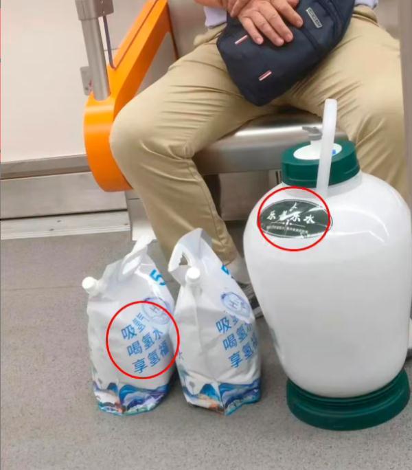口袋上寫著“吸氫氣,喝氫水,享氫福”。