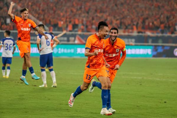 8月18日,山東泰山隊球員張弛(前)在比賽中慶祝進球。新華社記者 朱崢 攝