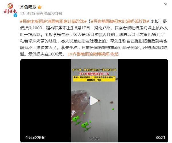 8月17日,河南鄭州。民宿老板吐槽房間墻上被客人吐一墻珍珠。老板李先生稱,客人是16日凌晨入住的,退房后自己才看見墻上全粘著珍珠奶茶的珍珠,客人說是她朋友吐墻上的。李先生稱自己提出賠償后就再也聯系不上這位客人了。李先生稱,目前房間墻壁得重新補膩子刷漆,還得通風散味道。最低損失在1000元。