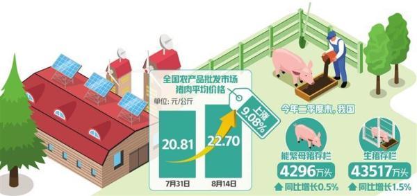 農(nóng)業(yè)農(nóng)村部監(jiān)測數(shù)據(jù)顯示,8月14日,全國農(nóng)產(chǎn)品批發(fā)市場豬肉平均價格為22.70元/公斤,比7月31日的20.81元/公斤上漲9.08%。“近期,全國生豬價格開始觸底,最近一段時間豬價快速反彈,生豬行情逐漸向好。”中國農(nóng)業(yè)科學(xué)院北京畜牧獸醫(yī)研究所研究員朱增勇對記者說。