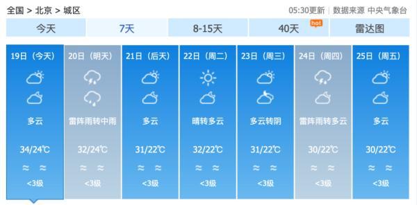 北京市氣象臺19日9時發布今天白天晴間多云,午后山區局地有雷陣雨,北轉南風二三級,最高氣溫34℃;夜間晴轉多云,南轉北風一二級,最低氣溫24℃。今天白天晴曬悶熱,注意防暑防曬多補水;明天午后到夜間有雷陣雨,注意防雷避雨,盡量減少山區出行。