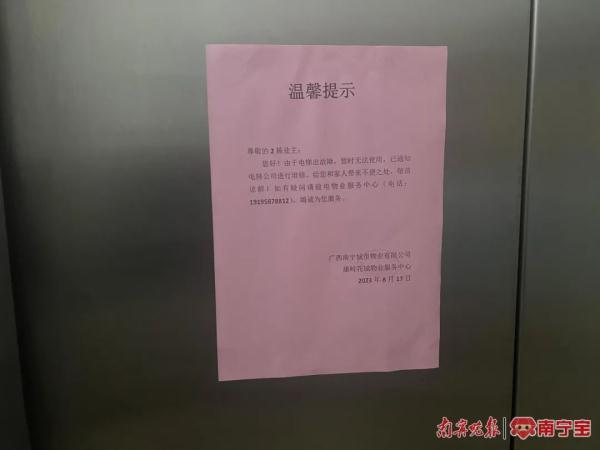近日,南寧市民周先生向南寧晚報報料熱線5530111反映,自家小區同一樓棟內兩臺電梯同時停止運行,但是物業卻不及時粘貼維修告示,質疑物業存在不作為的情況。