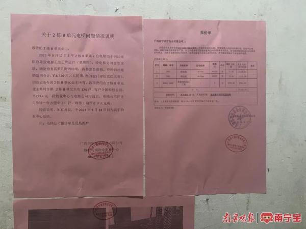 李先生告訴記者,由于電梯的鋼絲繩均有不同的規格,必須找到電梯廠家購買或定制,小區所使用的電梯已經較為老舊,許多配件在南寧買不到,購買材料所需費用和維修費用均要評估計算并粘貼告示向業主反饋,諸多問題相加才導致了電梯問題直至18日下午仍未解決。