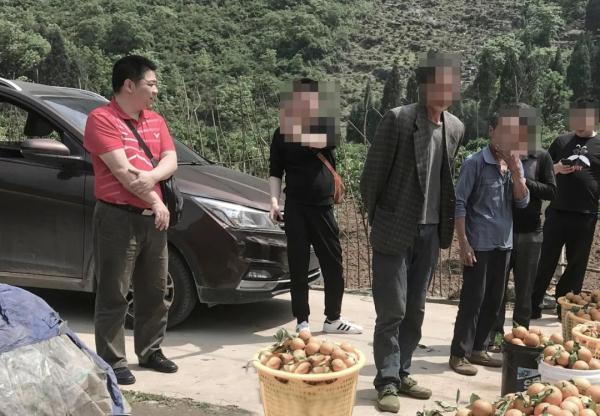 潘春泉(左一)幫助轄區困難群眾推銷水果