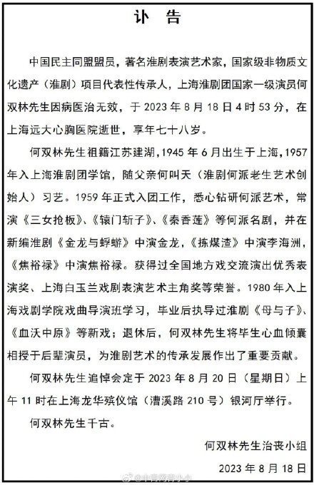 上海淮劇團發(fā)訃告稱著名淮劇表演藝術(shù)家、國家一級演員何雙林先生因病醫(yī)治無效,于2023年8月18日4時53分在上海遠大心胸醫(yī)院逝世,享年七十八歲。為淮劇藝術(shù)的傳承發(fā)展作出了重要貢獻。
