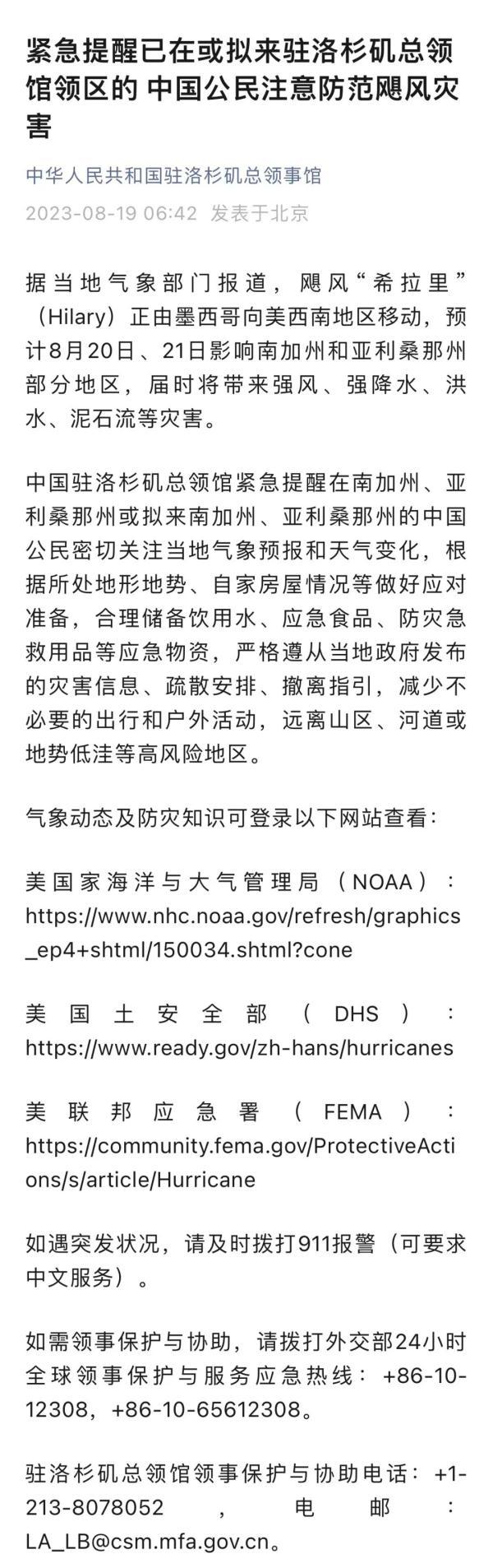 當地時間8月19日,中國駐洛杉磯總領事館微信公眾號發布消息稱,據當地氣象部門報道,颶風“希拉里”(Hilary)正由墨西哥向美西南地區移動,預計8月20日、21日影響南加州和亞利桑那州部分地區,屆時將帶來強風、強降水、洪水、泥石流等災害。