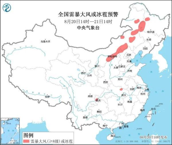 預計8月20日14時至21日14時,內蒙古中東部、黑龍江西部、吉林西北部、陜西北部、河北北部、湖北北部、重慶西部等地的部分地區將有8-10級雷暴大風或冰雹天氣;內蒙古中東部、黑龍江西部、吉林西部和南部、遼寧西部、陜西南部、山西北部和南部、河北中東部和南部、北京東部和南部、天津、山東中西部、河南北部和西南部、江蘇北部、湖北北部和西部、湖南北部和南部、江西中部、浙江中北部、福建東部、四川東部和南部、重慶中北部、云南西部和南部、廣西中部、廣東中北部、海南島西北部等地的部分地區將有短時強降水天氣,最大小時雨量30-50毫米,局地可達60毫米以上。