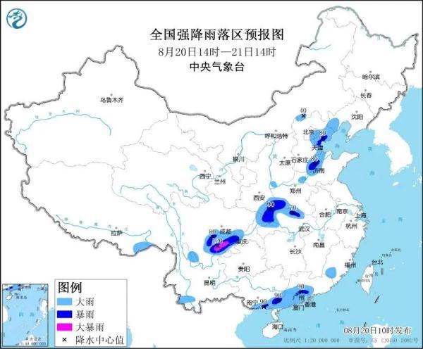 中央氣象臺8月20日10時發布暴雨藍色預警: