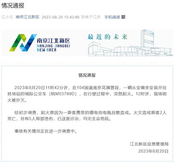 2023年8月20日11時42分許,在104國道南京花旗營段,一輛從安徽來安縣開往林場站的城際公交車(皖M03799D),在行駛過程中,突然起火。12時許,現場明火被撲滅。