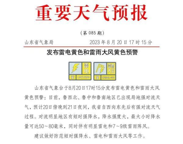 山東省氣象臺(tái)8月20日17時(shí)15分發(fā)布雷電黃色和雷雨大風(fēng)黃色預(yù)警:目前,魯西北、魯中和魯南地區(qū)已出現(xiàn)局地強(qiáng)對(duì)流天氣,預(yù)計(jì)20日傍晚到21日夜間,山東自西向東先后有強(qiáng)對(duì)流天氣過程。對(duì)流明顯地區(qū)有短時(shí)強(qiáng)降水,降水強(qiáng)度大,最大小時(shí)降水量可達(dá)50~80毫米,同時(shí)伴有明顯雷電和7~9級(jí)雷雨陣風(fēng)。
