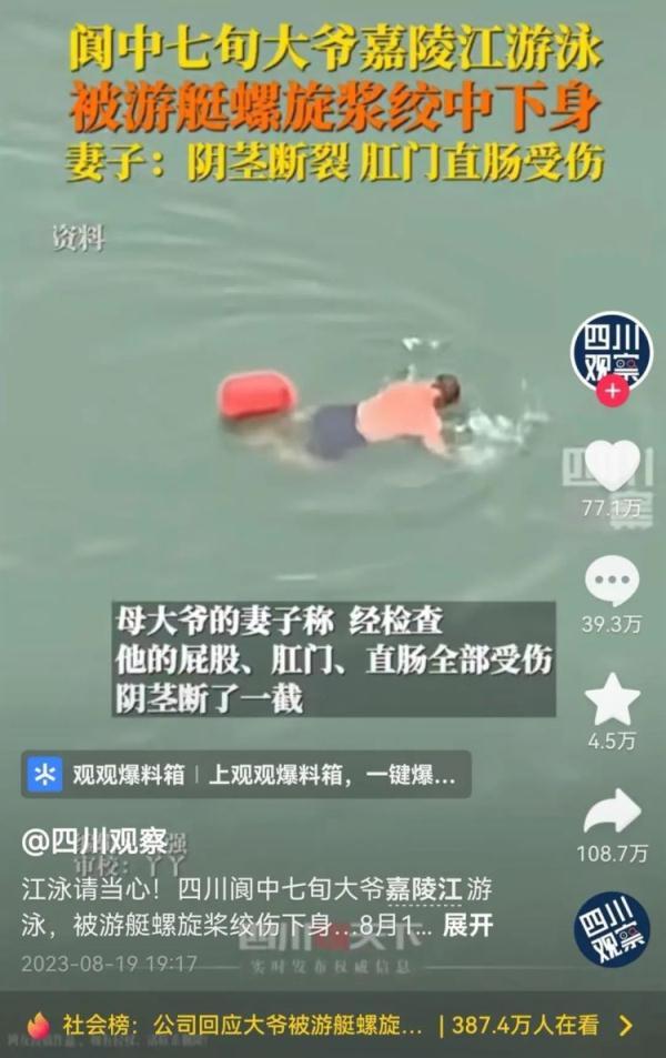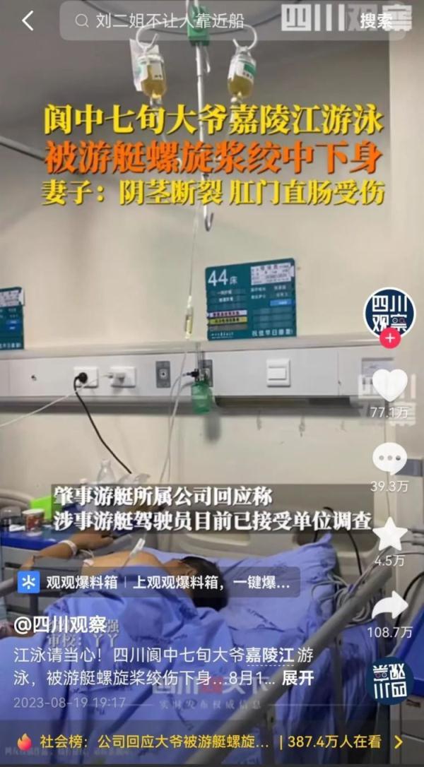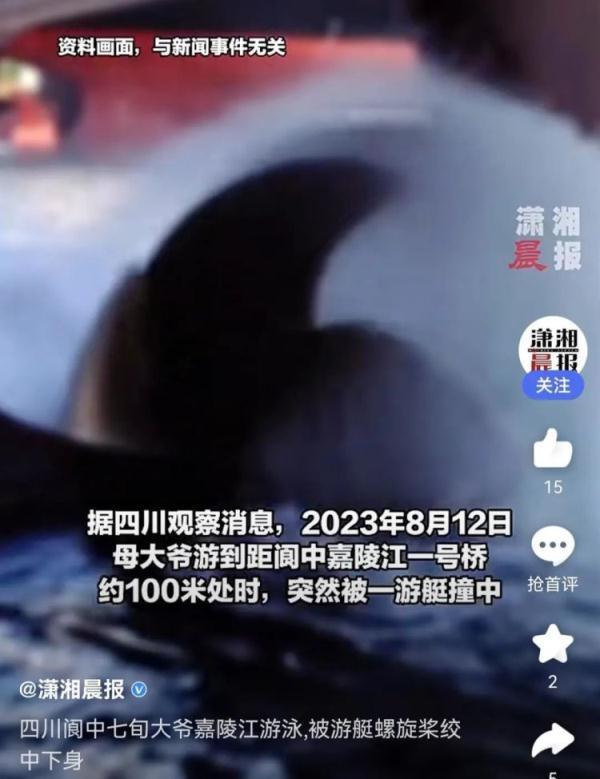 近日,四川南充閬中,一名七旬大爺在嘉陵江游泳時(shí),被經(jīng)過(guò)的游艇螺旋槳絞中,多處受傷。
