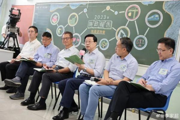 香港特區行政長官李家超率領21位司局級官員今日(20日)到筲箕灣出席2023年施政報告地區咨詢會,直接聽取地區人士對本屆特區政府第二份施政報告的意見和建議,約120位來自不同背景的市民出席。