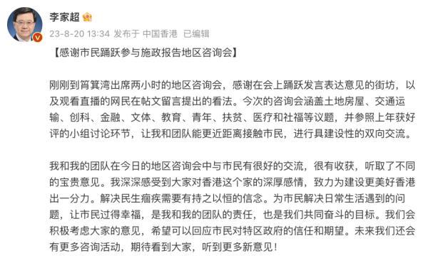 咨詢會后,李家超于社交媒體發文,感謝在會上踴躍發言表達意見的街坊,以及觀看直播的網民在帖文留言提出的看法。李家超說,深深感受到大家對香港這個家的深厚感情。他強調,解決民生痼疾需要有持之以恒的信念。