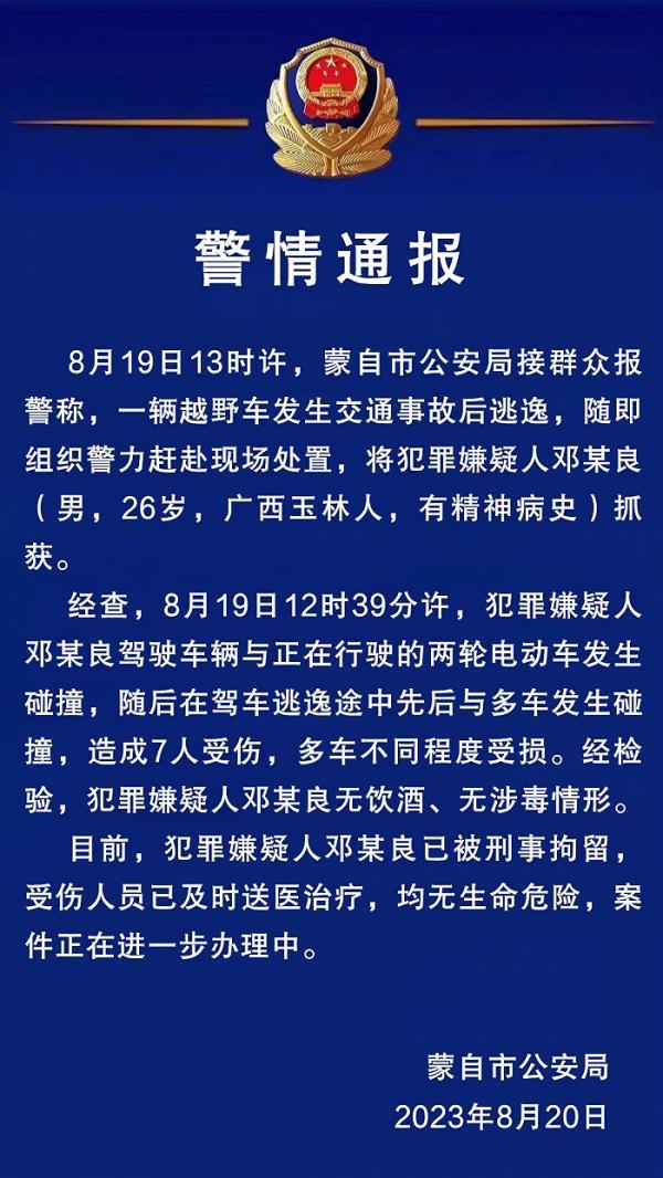 云南蒙自市公安局20日發布警情通報,8月19日13時許,蒙自市公安局接群眾報警稱,一輛越野車發生交通事故后逃逸,隨即組織警力趕赴現場處置,將犯罪嫌疑人鄧某良(男,26歲,廣西玉林人,有精神病史)抓獲。