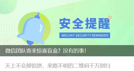提醒中表示,近期,有人收到以“微信團(tuán)隊(duì)”名義寄出的“驚喜盲盒”快遞,內(nèi)含一張印有二維碼的卡片。