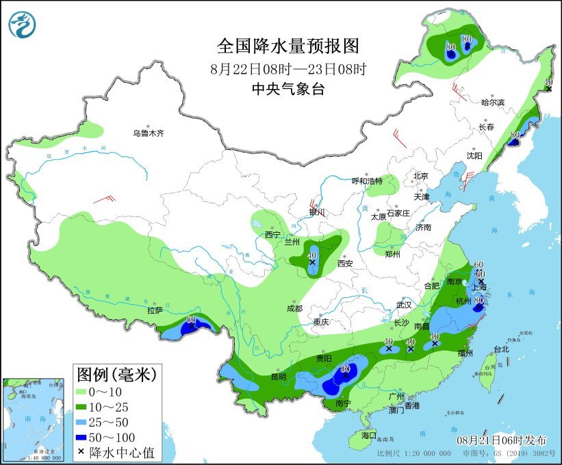 圖3 全國降水量預報圖(8月21日08時-22日08時)