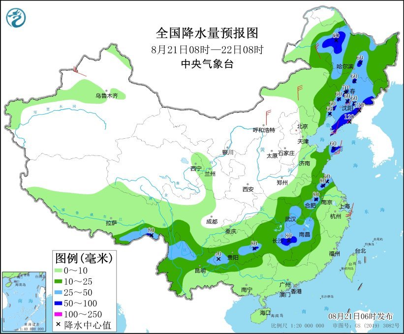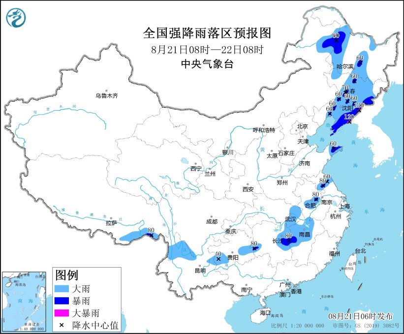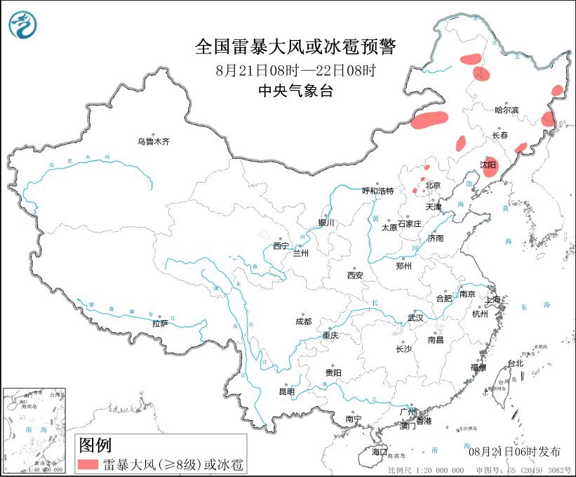 預計,8月21日08時至22日08時,內蒙古東北部、黑龍江中西部、吉林中東部、遼寧中東部、山東半島東部、江蘇北部、安徽中部、湖北東部、湖南中部、江西中北部、云南西北部、貴州中南部、西藏東南部等地部分地區有大到暴雨,其中,吉林東南部、遼寧東部等地局地有大暴雨(100~120毫米)(圖1);上述部分地區伴有短時強降水(最大小時降雨量30~50毫米,局地可超過60毫米),內蒙古東北部、黑龍江東部和西南部、吉林東南部、遼寧東部等地的部分地區將有8~10級雷暴大風或冰雹天氣(圖2)。 中央氣象臺21日06時繼續發布暴雨藍色預警和強對流天氣藍色預警。