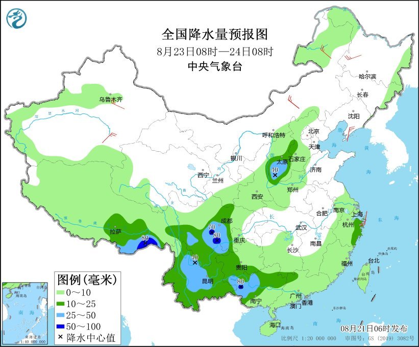 8月23日08時至24日08時,山西中南部、浙江東部、四川中南部、云南、貴州西部和南部、廣西中北部、西藏東南部等地部分地區有中到大雨,其中,四川盆地西南部、廣西西部等地部分地區有暴雨(50~80毫米)。內蒙古中東部、黑龍江西南部、遼東半島、浙江東部等地部分地區有4~5級風(見圖5)。