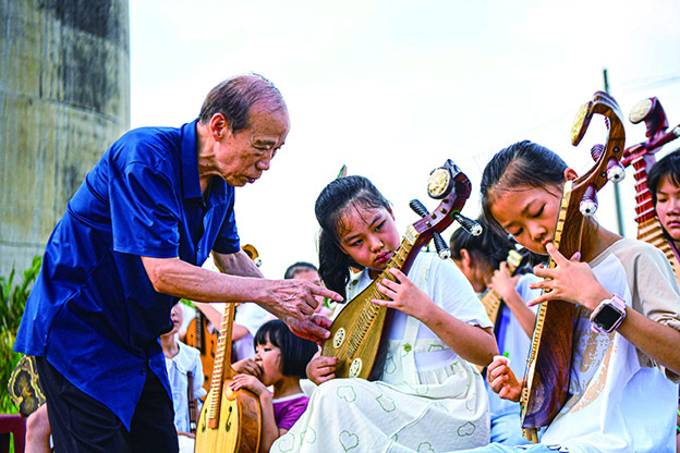 8月12日,李舒尤(左一)在枧頭洲村指導學生演奏柳琴。新華社記者薛宇舸攝