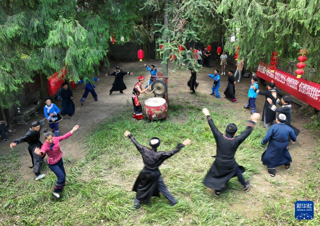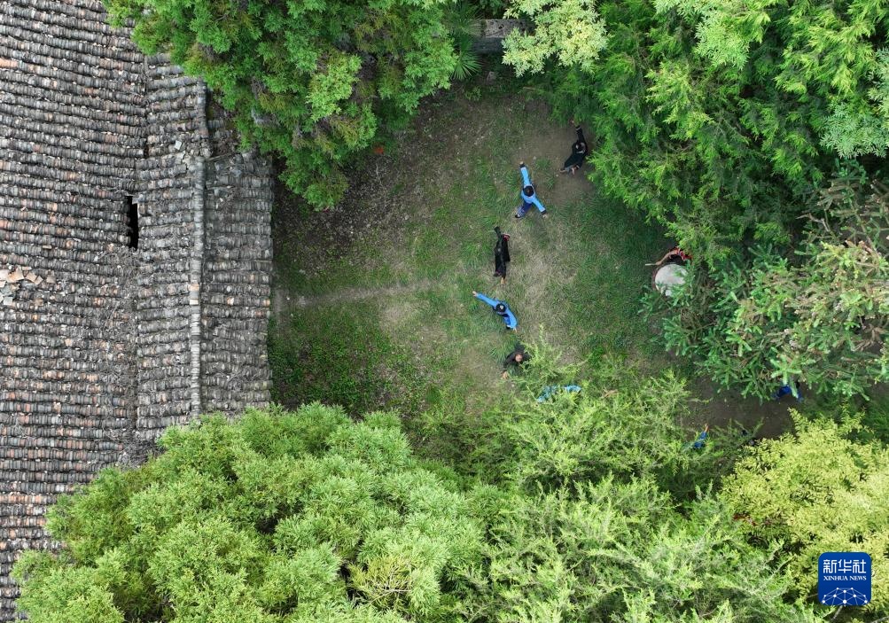 8月18日,舍米湖村村民在有著數百年歷史的“擺手堂”前跳起擺手舞(無人機照片)。