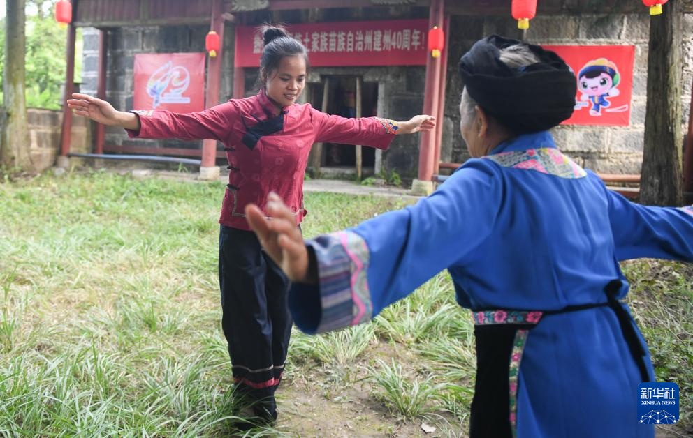 舍米湖村村民黎梅圍(左)跟著老人練習擺手舞(8月18日攝)。