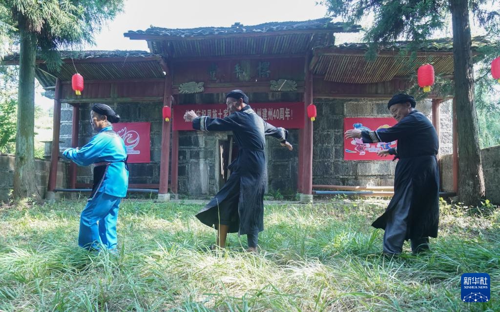 8月18日,舍米湖村村民在有著數百年歷史的“擺手堂”前跳起擺手舞。