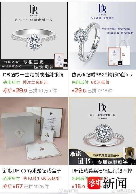 七夕將至,電商平臺上出現了一批“廉價求婚鉆戒”。有媒體記者選取了一家顯示月銷超過10萬的店鋪下單,發現59.8元的“DR鉆戒”不僅可以定制配套的“真愛協議”,還能提供“珠寶鑒定證書”和“DR包裝盒”。記者調查發現,這些商品的進貨價,可能只有個位數。從DR官方店鋪的價格分布來看,真品戒指價格從幾千元到幾十萬元不等。