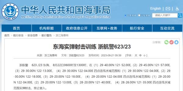 浙航警 623 /23 東海,8月22日0600時至1300時,在(1)29-40.00N 121-52.00E,(2)29-45.00N 121-57.00E,(3)29-30.00N 122-13.00E,(4)29-30.00N 122-04.00E 四點連線水域范圍和(1)29-30.00N 122-04.00E,(2)29-30.00N 122-18.00E,(3)29-20.00N 122-18.00E,(4)29-20.00N 122-04.00E 四點連線水域范圍和(1)29-20.00N 122-04.00E,(2)29-20.00N 122-13.00E,(3)28-20.00N 121-40.00E,(4)28-26.00N 121-35.00E四點連線水域范圍實彈射擊,禁止駛入。