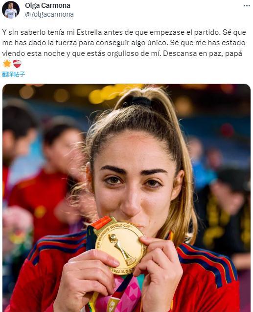 美聯(lián)社稱,終場哨響后,奧爾加和西班牙球員們一起在場上慶祝,在頒發(fā)獎杯時,她似乎也正常參與。奧爾加晚些時候在社交平臺X上說,“冥冥中,我在比賽開始前就擁有了自己的那顆星。我知道是你賦予了我力量,讓我取得了獨(dú)一無二的成就。我知道你今晚在注視著我,你為我感到驕傲。安息吧,父親?!彼€附上了一張自己親吻獎牌的照片。