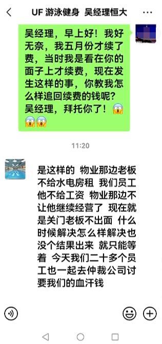 有會員在微信問健身房的經理和教練,對方就表示,因為老板不交水電費、房租,物業不給經營了,現在只能關門,而員工的工資還被拖欠著。但是,會員稱根本就沒見過老板出面,物業方面也沒有解釋。