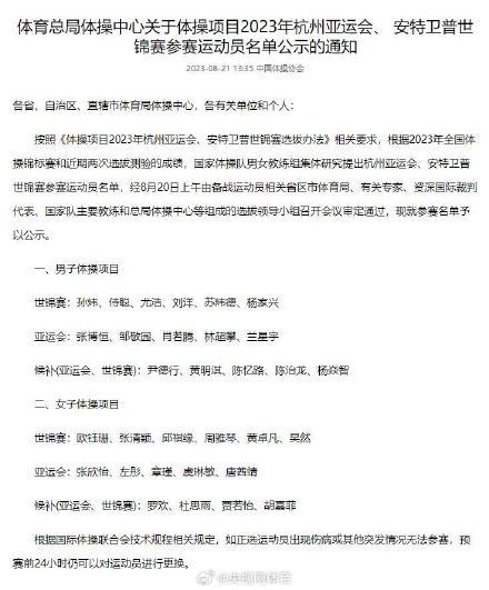 北京時間8月21日,中國體操隊杭州亞運會、安特衛普世錦賽參賽運動員名單出爐根據規定,如正選運動員出現傷病或其他突發情況無法參賽,預賽前24小時仍可以對運動員進行更換。