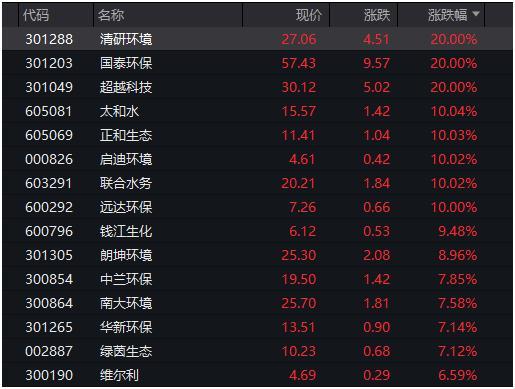環保等板塊逆勢上漲,并掀起漲停潮,盤中近10股漲停,超越科技、清研環境等多股“20CM漲?!保碛卸喙墒毡P漲停。
