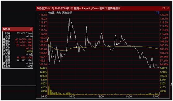 行情數據顯示,新股協昌科技盤中漲幅一度高達123.94%,股價一度達到116.18元,若照此價格計算,中一簽新股可賺約3.2萬元,截至收盤時,協昌科技報100.18元,漲幅93.10%。