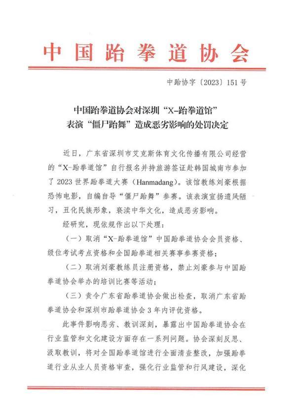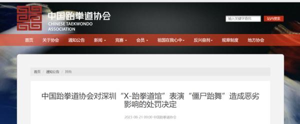 8月21日,中國跆拳道協會官網發布對深圳“X-跆拳道館”表演“僵尸跆舞”造成惡劣影響的處罰決定。