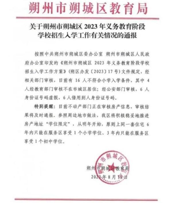 近日,山西省朔州市朔城區教育局通報2023年義務教育階段學校招生入學工作情況。經相關部門審核,目前有16人不符合小學入學條件,其中4人經教育部門審核不在市城區居住。經公安部門審核,6 人身份證號碼虛假,6人借用別人身份證號碼。