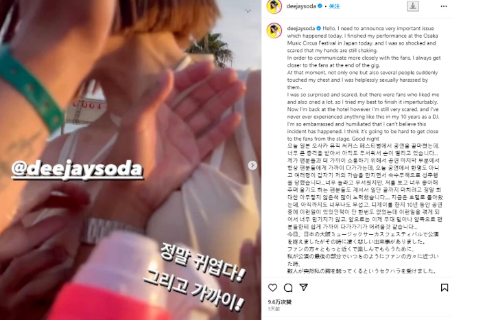 【環(huán)球時報(bào)綜合報(bào)道】有韓國第一美女DJ之稱的黃素熙(DJ SODA)日前在日本大阪府泉南市的音樂節(jié)活動期間遭遇觀眾襲胸,活動主辦方TryHard Japan公司21日以涉嫌猥褻和疑似暴力行為為由,向大阪府警方提出訴訟,指控3名男女觀眾侵害黃素熙。