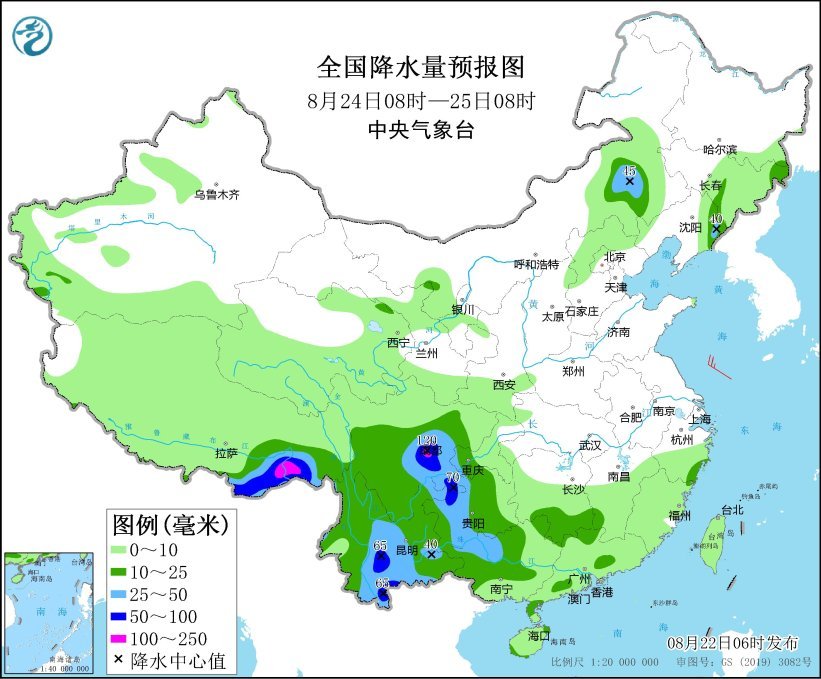 8月24日08時至25日08時,四川盆地南部、貴州西部、廣西西北部、云南中南部、西藏東南部、內蒙古東南部、遼寧東北部等地部分地區有大到暴雨,其中,四川盆地西南部、西藏東南部等地局地有大暴雨(100~120毫米)(見圖4)。