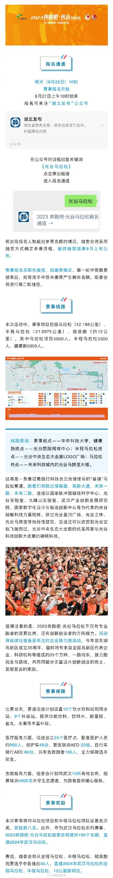 8月21日,“2023奔跑吧·光谷馬拉松”新聞發布會在武漢舉行,賽事于8月22日10時開始報名,10月28日鳴槍起跑,并在活動當天通過電視、新媒體等渠道全程直播。