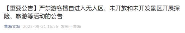 8月21日,青海省文化和旅游廳官方微信發布《嚴禁游客擅自進入無人區、未開放和未開發景區開展探險、旅游等活動的公告》,其中明確: