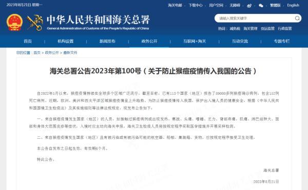 8月21日,海關(guān)總署發(fā)布關(guān)于防止猴痘疫情傳入我國(guó)的公告: