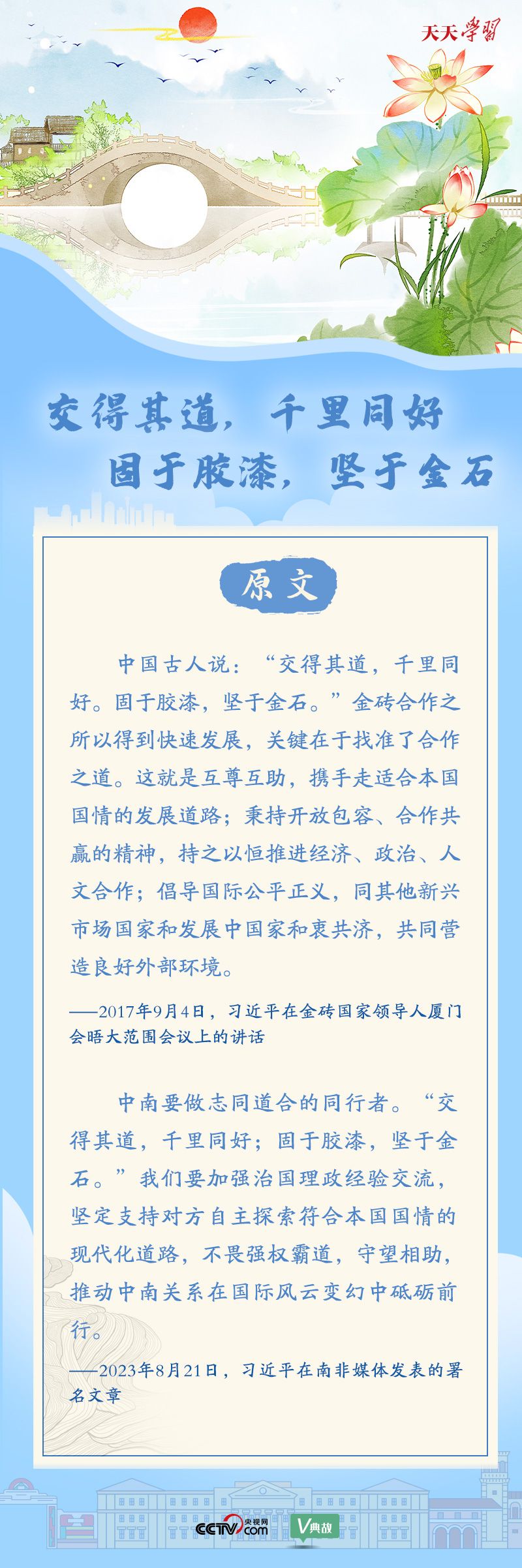 8月21日,在赴約翰內斯堡出席金磚國家領導人第十五次會晤并對南非進行國事訪問之際,習近平主席在南非《星報》《開普時報》《水星報》和南非獨立媒體網站發表題為《讓中南友好合作的巨輪揚帆遠航》的署名文章。他引用中國古語“交得其道,千里同好;固于膠漆,堅于金石”,盛贊中南兩國是志同道合的同行者。在2017年金磚國家領導人廈門會晤大范圍會議上,習近平主席也引用這句古語,指出金磚合作之所以得到快速發展,關鍵在于找準了合作之道。