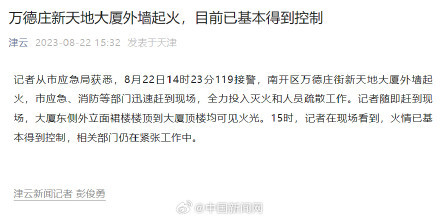 記者從天津市應急局獲悉,8月22日14時23分119接警,南開區萬德莊街新天地大廈外墻起火,市應急、消防等部門迅速趕到現場,全力投入滅火和人員疏散工作。記者隨即趕到現場,大廈東側外立面裙樓樓頂到大廈頂樓均可見火光。15時,記者在現場看到,火情已基本得到控制,相關部門仍在緊張工作中。(津云)