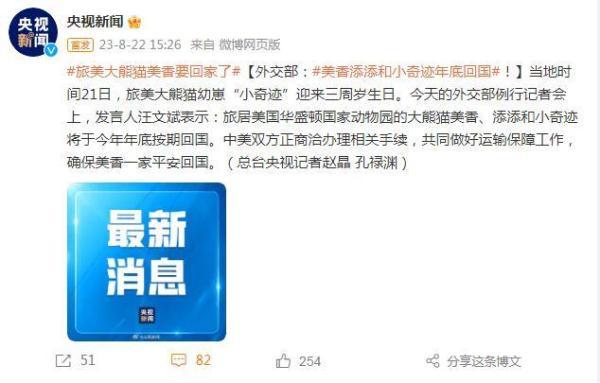 當?shù)貢r間21日,旅美大熊貓幼崽“小奇跡”迎來三周歲生日。今天的外交部例行記者會上,發(fā)言人汪文斌表示:旅居美國華盛頓國家動物園的大熊貓美香、添添和小奇跡將于今年年底按期回國。中美雙方正商洽辦理相關手續(xù),共同做好運輸保障工作,確保美香一家平安回國。(總臺央視記者趙晶孔祿淵)