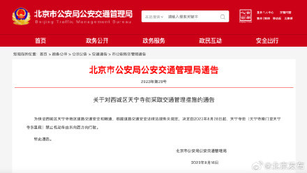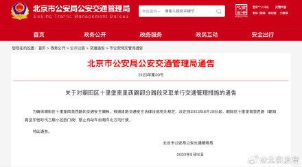8月22日,北京市交管局網站發布通告,自2023年8月28日起,天寧寺街(天寧寺南門至天寧寺東里段)禁止機動車由東向西方向行駛;朝陽區十里堡南里西路(朝陽路至東恒時代三期小區西門段)禁止機動車由南向北方向行駛。