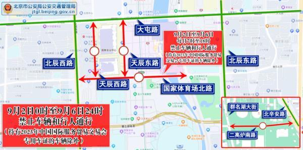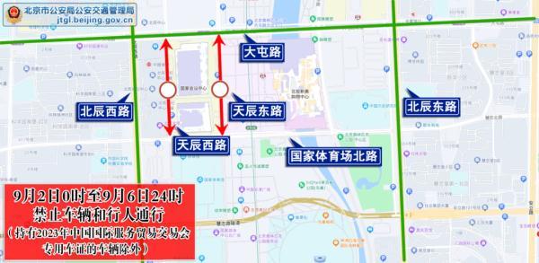 (二)9月2日0時至9月6日24時,天辰東路由國家體育場北路與天辰東路交叉口(不含)至大屯路與天辰東路交叉口(不含)南向北方向、天辰西路由國家體育場北路與天辰西路交叉口(不含)至大屯路與天辰西路交叉口(不含)南北雙方向,禁止車輛和行人通行。途經車輛和行人可經北辰東路、北辰西路、大屯路繞行。