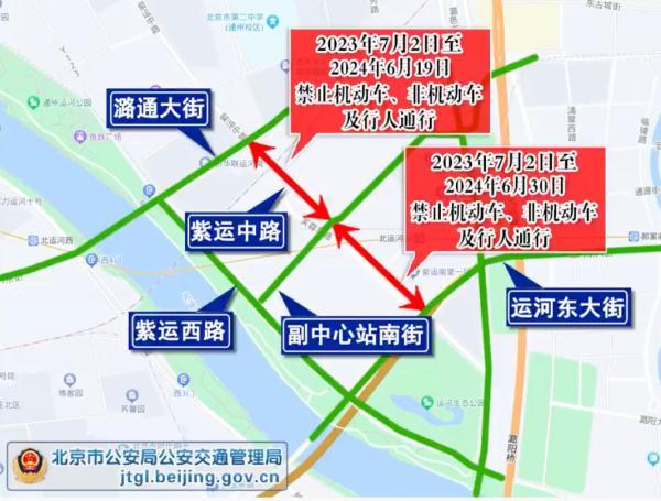 為保證北京城市副中心站綜合交通樞紐工程施工期間的道路交通安全與暢通,根據道路交通安全法律法規有關規定,決定通州區紫運中路(紫運中路與潞通大街相交路口至紫運中路與副中心站南街相交路口)禁止機動車、非機動車及行人通行的交通管理措施延期至2024年6月19日,過往車輛及行人可繞行副中心站南街、紫運西路、潞通大街等周邊道路通行。